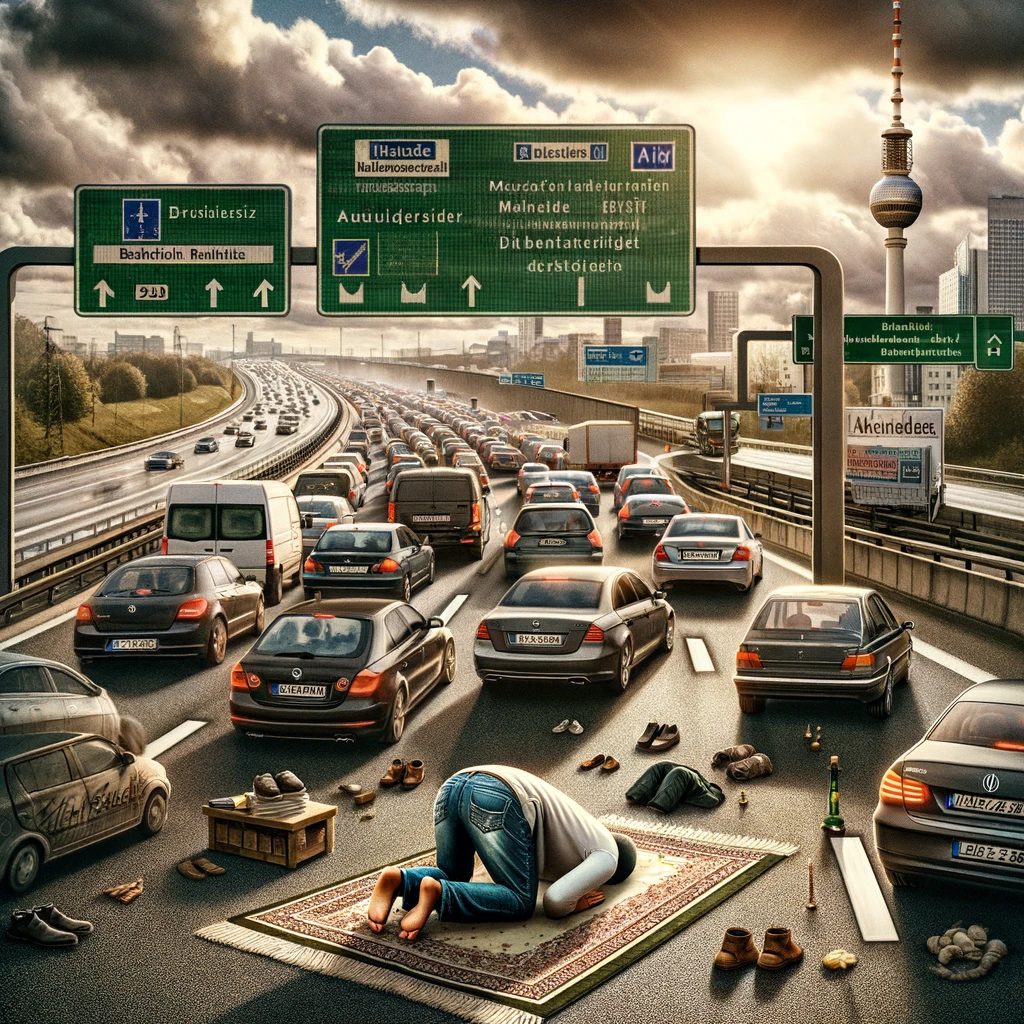 Content: In Germany, a Muslim man was reported to have blocked a motorway to pray to Allah. The incident raises questions about the normalcy of such actions.